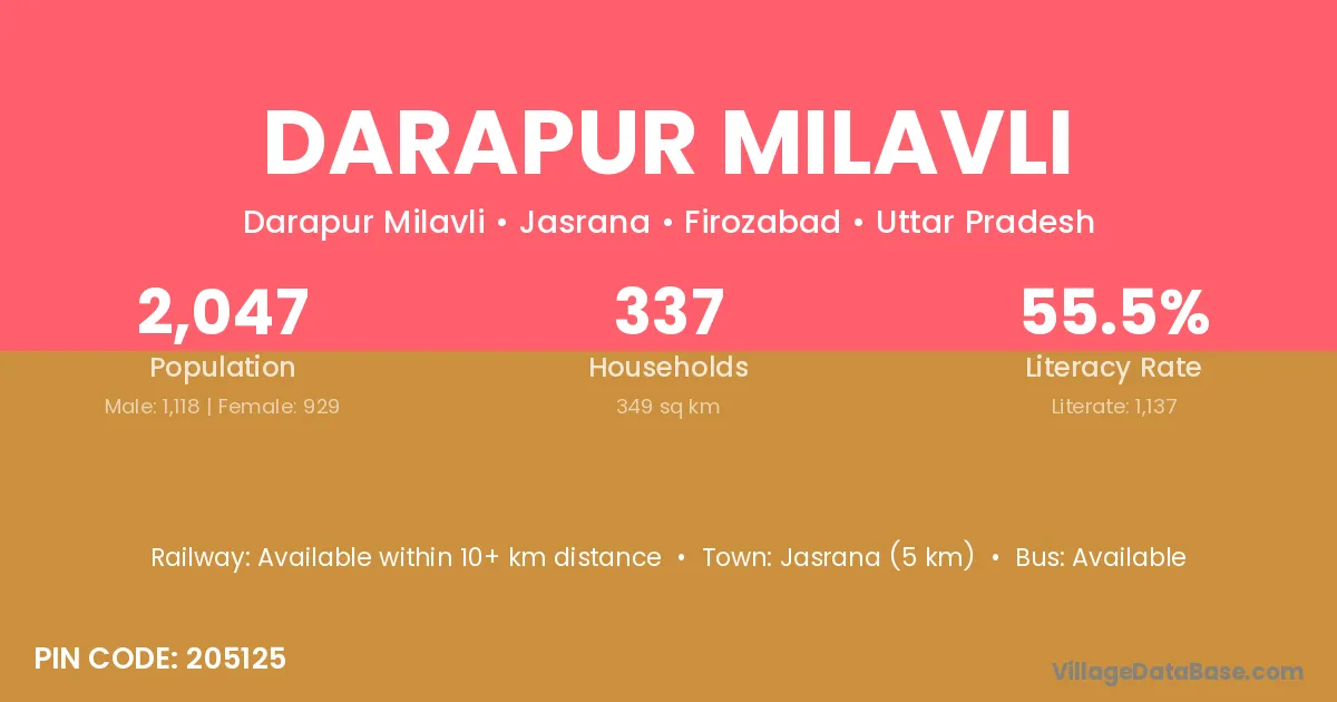 Jasrana (5 km) is the nearest town to Darapur Milavli village for major economic activities and is located approximately 5 km away.