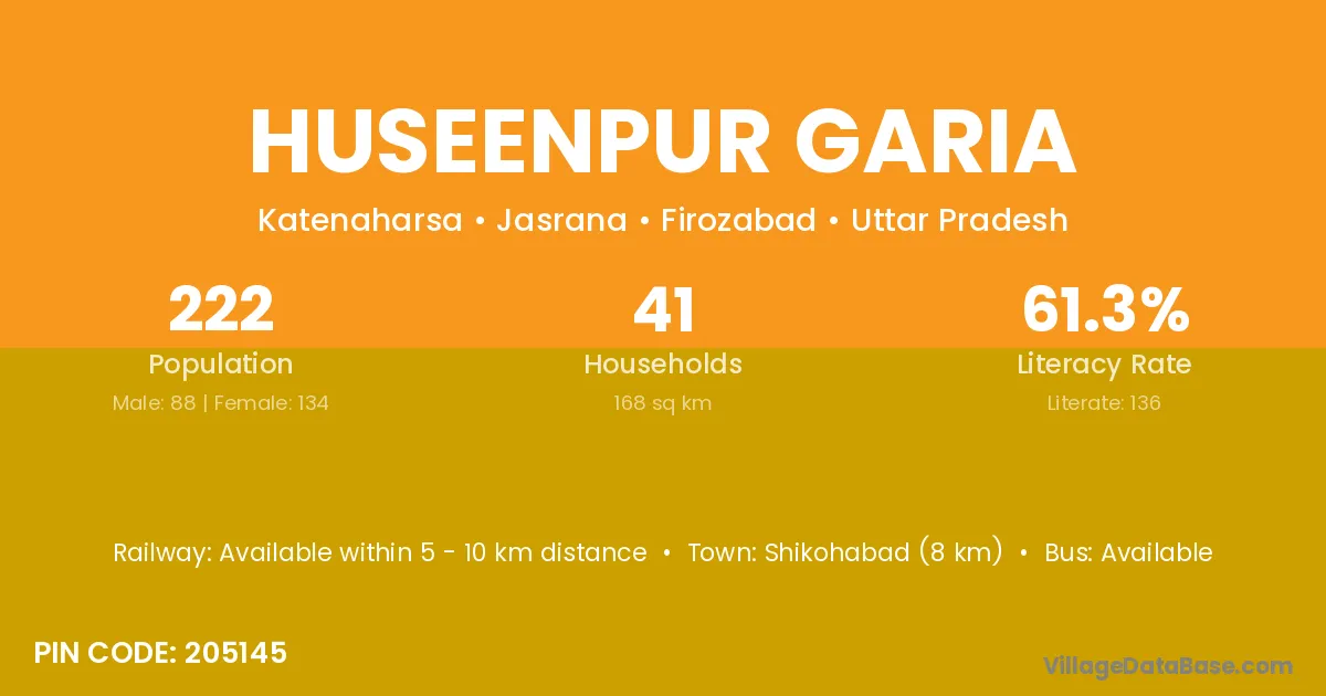 Shikohabad (8 km) is the nearest town to Huseenpur Garia village for major economic activities and is located approximately 8 km away.