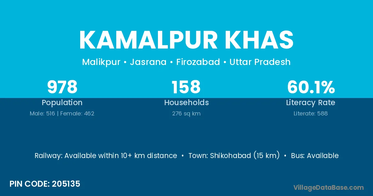 Shikohabad (15 km) is the nearest town to Kamalpur Khas village for major economic activities and is located approximately 15 km away.