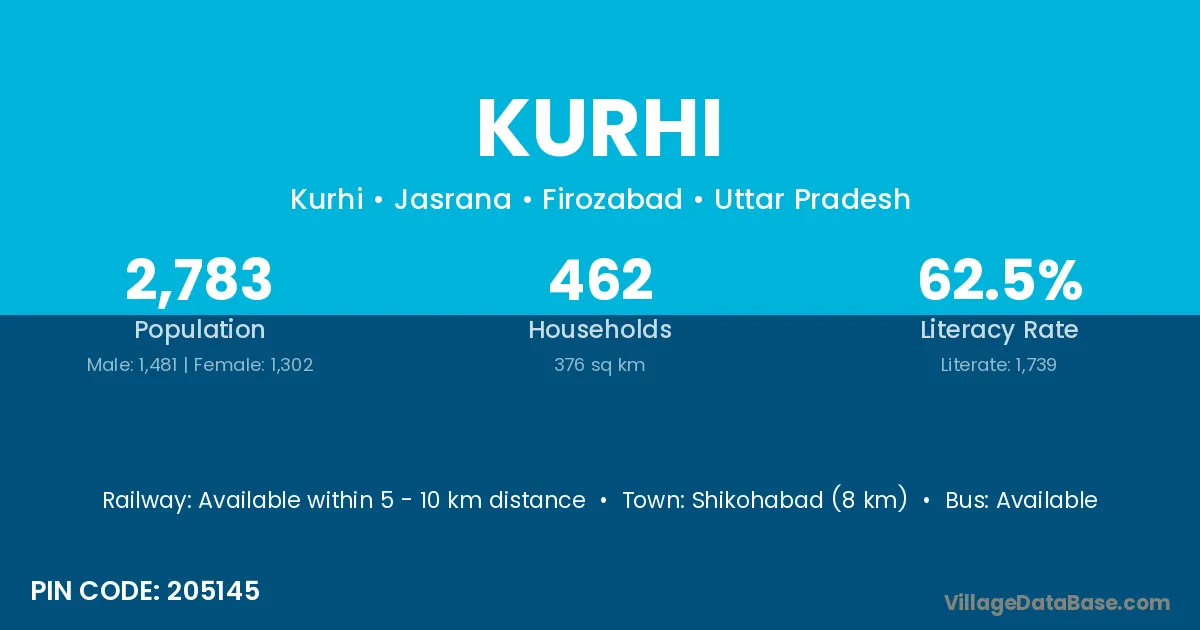 Shikohabad (8 km) is the nearest town to Kurhi village for major economic activities and is located approximately 8 km away.