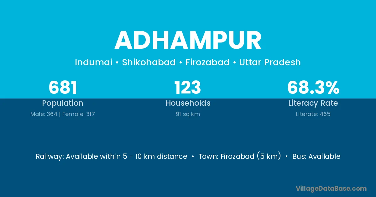 Firozabad (5 km) is the nearest town to Adhampur village for major economic activities and is located approximately 5 km away.