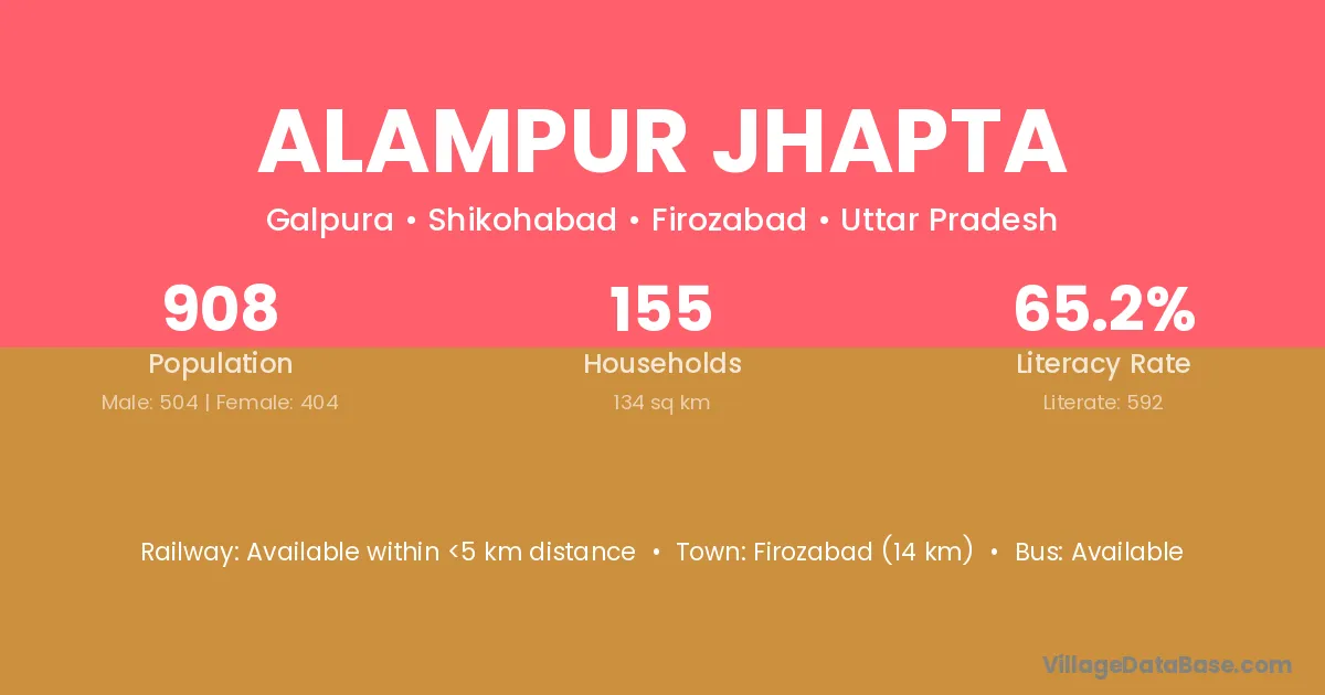 Firozabad (14 km) is the nearest town to Alampur Jhapta village for major economic activities and is located approximately 14 km away.
