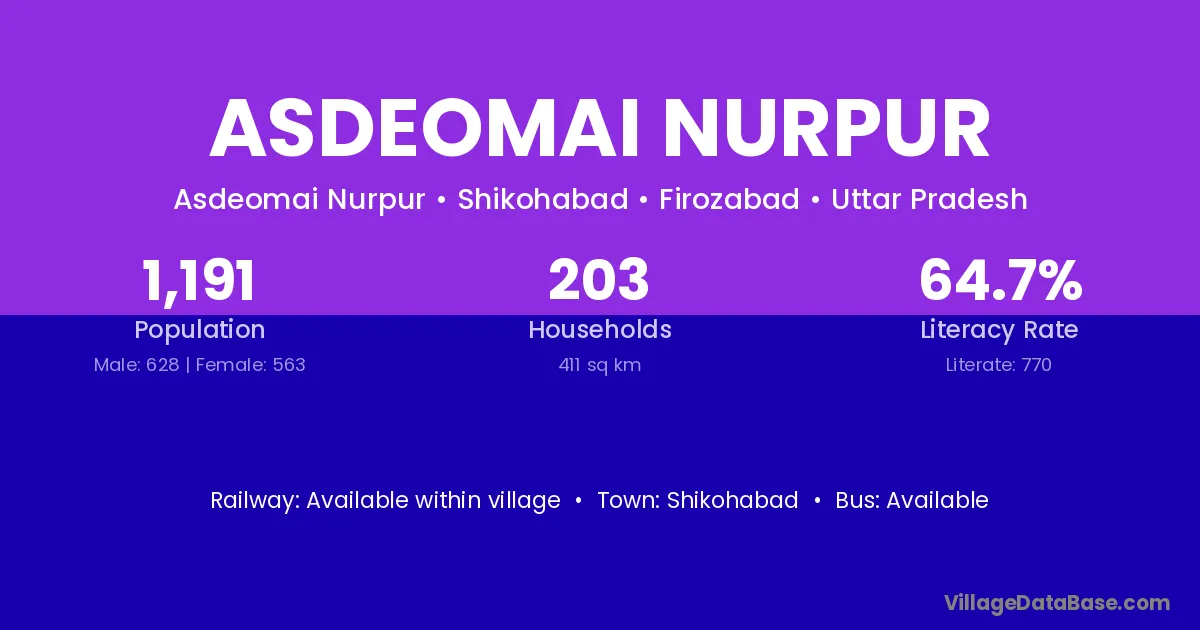 Shikohabad is the nearest town to Asdeomai Nurpur village for major economic activities