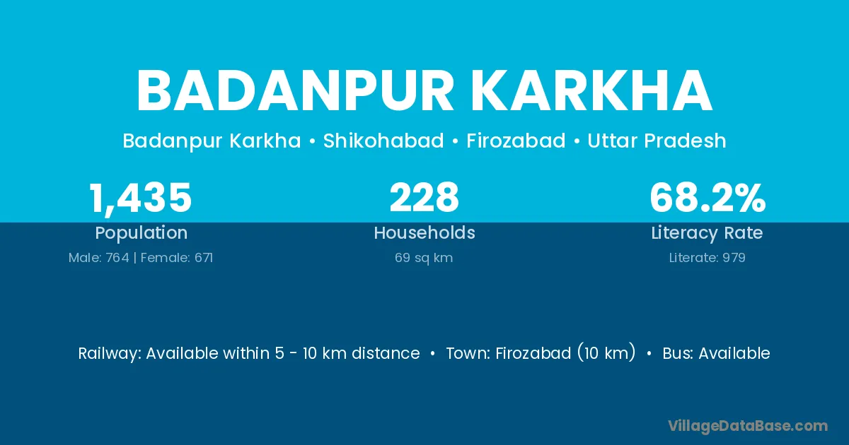 Firozabad (10 km) is the nearest town to Badanpur Karkha village for major economic activities and is located approximately 10 km away.