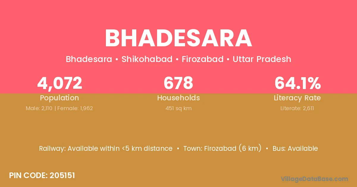 Firozabad (6 km) is the nearest town to Bhadesara village for major economic activities and is located approximately 6 km away.