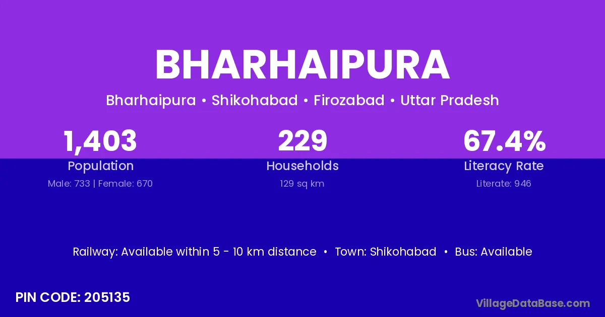 Shikohabad is the nearest town to Bharhaipura village for major economic activities