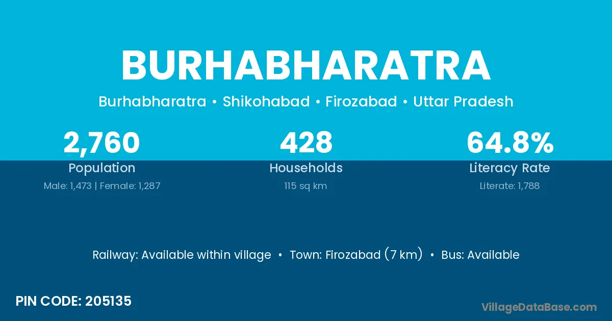 Firozabad (7 km) is the nearest town to Burhabharatra village for major economic activities and is located approximately 7 km away.
