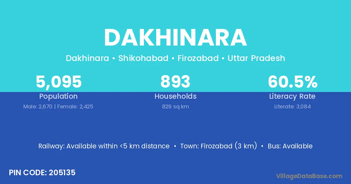 Firozabad (3 km) is the nearest town to Dakhinara village for major economic activities and is located approximately 3 km away.