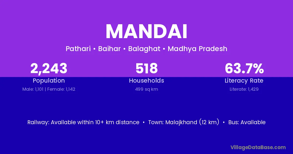 Mandai village has a total population of 2,310 people, of which 1,212 are males and 1,098 are females.