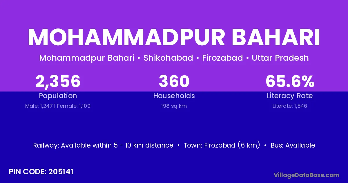 Firozabad (6 km) is the nearest town to Mohammadpur Bahari village for major economic activities and is located approximately 6 km away.
