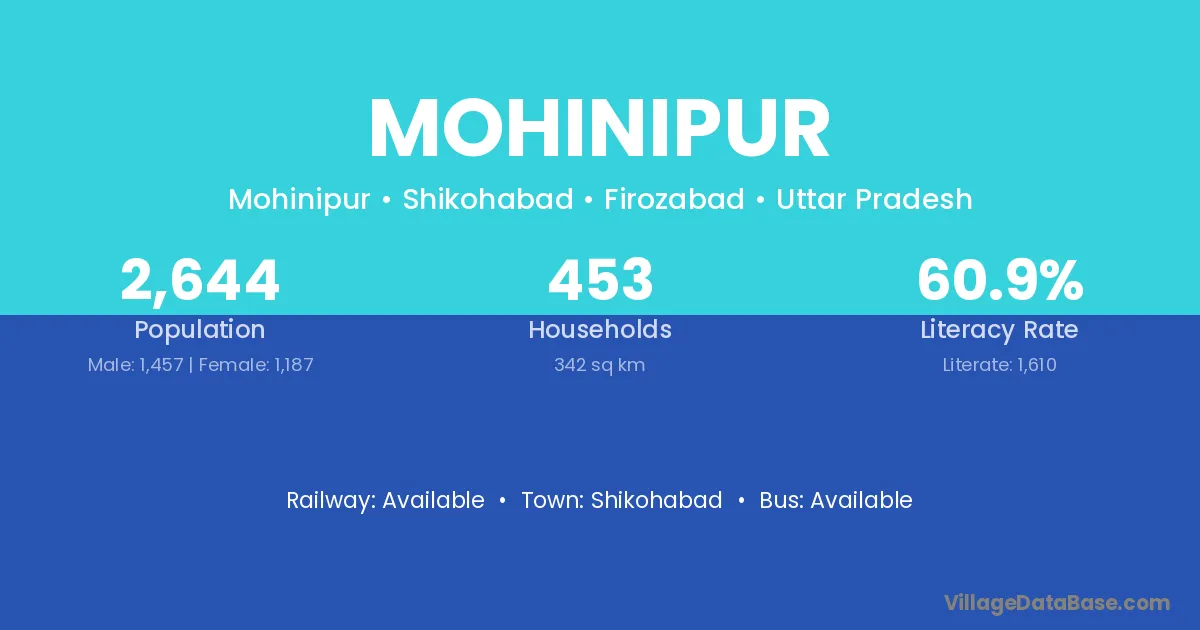 Shikohabad is the nearest town to Mohinipur village for major economic activities