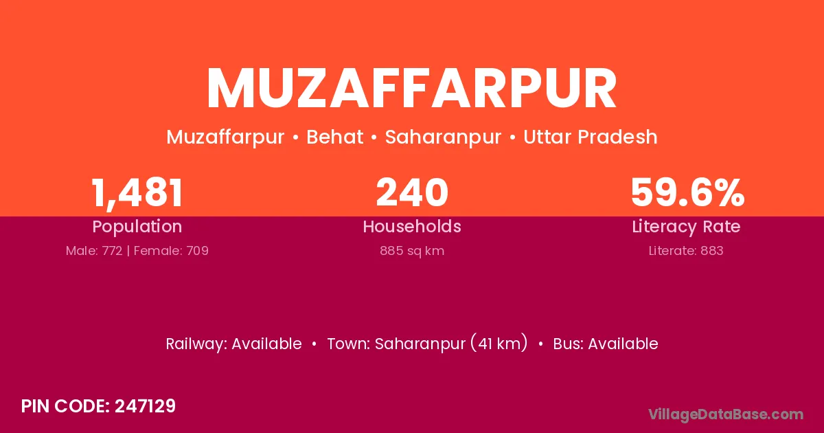 Firozabad (6 km) is the nearest town to Muzaffarpur village for major economic activities and is located approximately 6 km away.