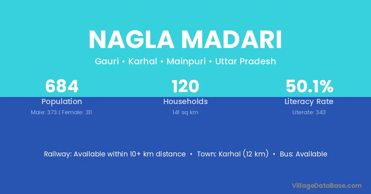 The literacy rate of Nagla Madari village is 67.24%. Male literacy stands at 77.50% and female literacy at 54.93%.