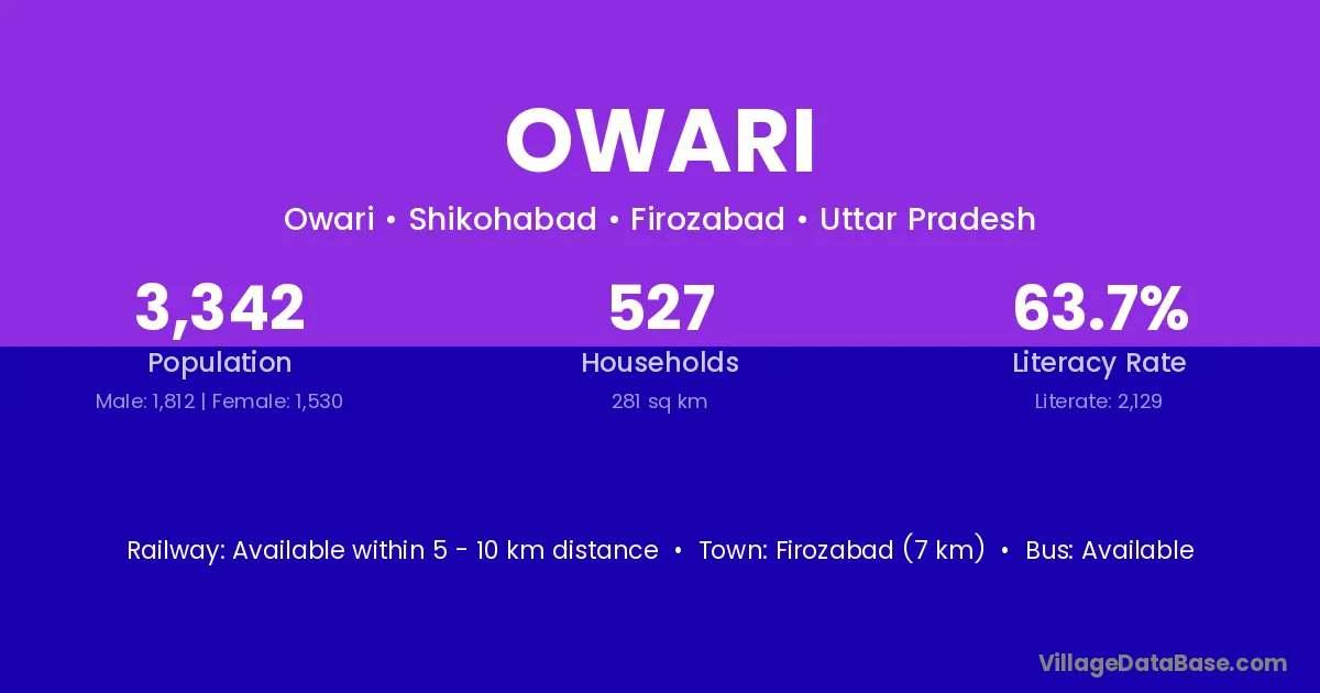 Firozabad (7 km) is the nearest town to Owari village for major economic activities and is located approximately 7 km away.