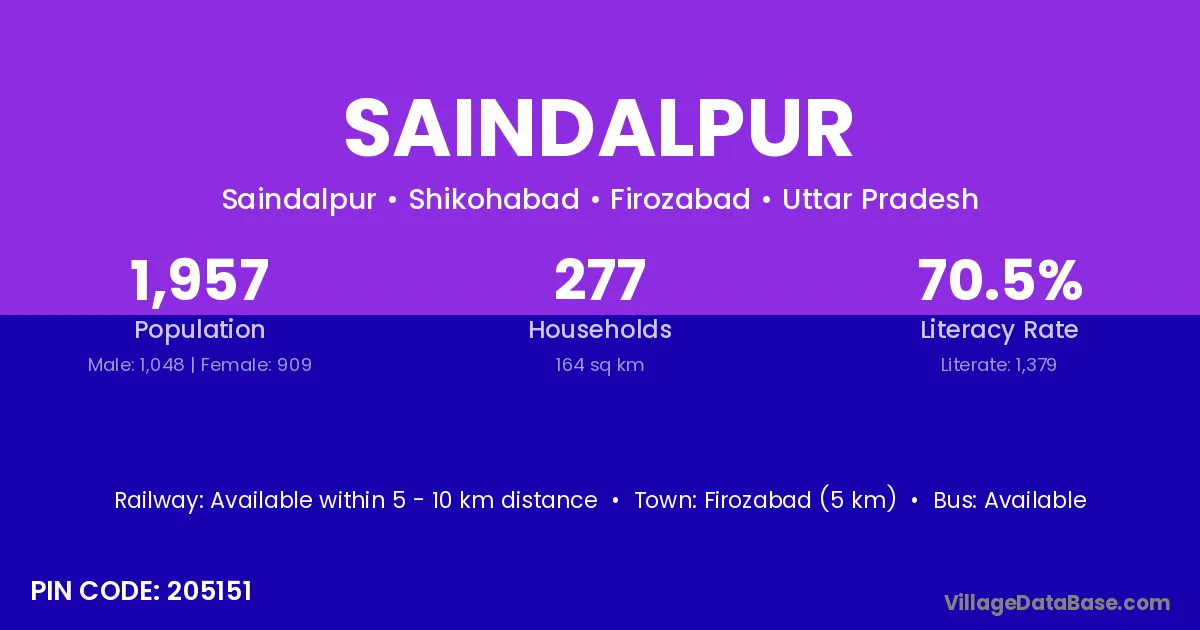 Firozabad (5 km) is the nearest town to Saindalpur village for major economic activities and is located approximately 5 km away.