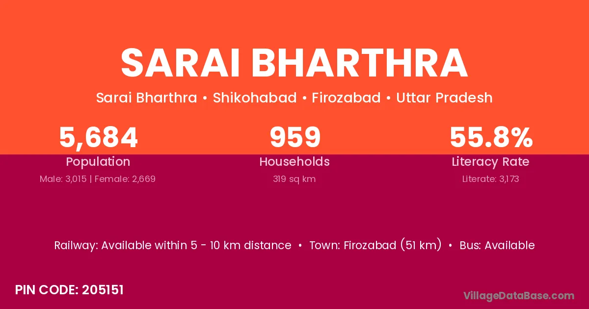 Firozabad (51 km) is the nearest town to Sarai Bharthra village for major economic activities and is located approximately 51 km away.