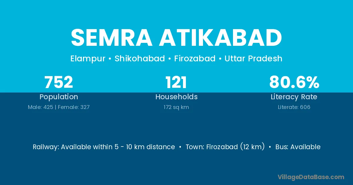 Firozabad (12 km) is the nearest town to Semra Atikabad village for major economic activities and is located approximately 12 km away.