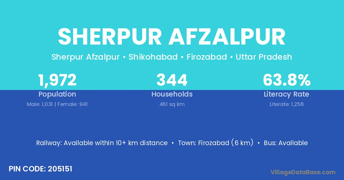 Firozabad (6 km) is the nearest town to Sherpur Afzalpur village for major economic activities and is located approximately 6 km away.