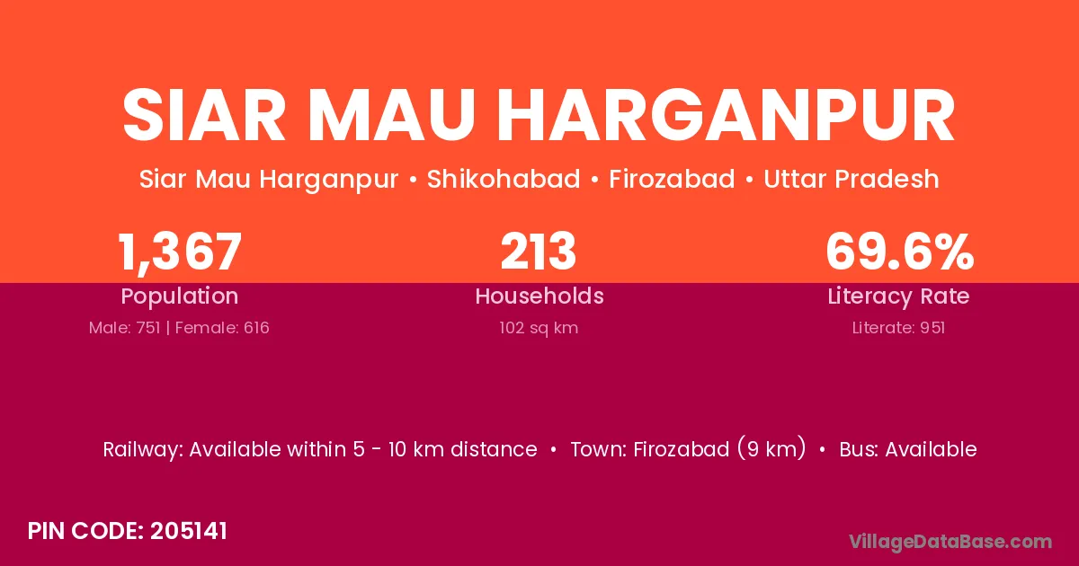 Firozabad (9 km) is the nearest town to Siar Mau Harganpur village for major economic activities and is located approximately 9 km away.