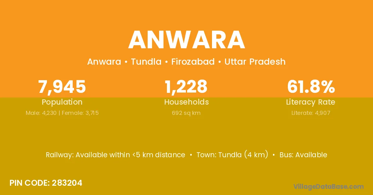 Tundla (4 km) is the nearest town to Anwara village for major economic activities and is located approximately 4 km away.
