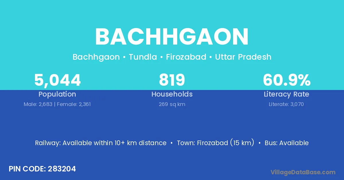 Firozabad (15 km) is the nearest town to Bachhgaon village for major economic activities and is located approximately 15 km away.