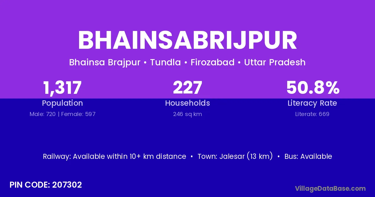 Jalesar (13 km) is the nearest town to Bhainsabrijpur village for major economic activities and is located approximately 13 km away.