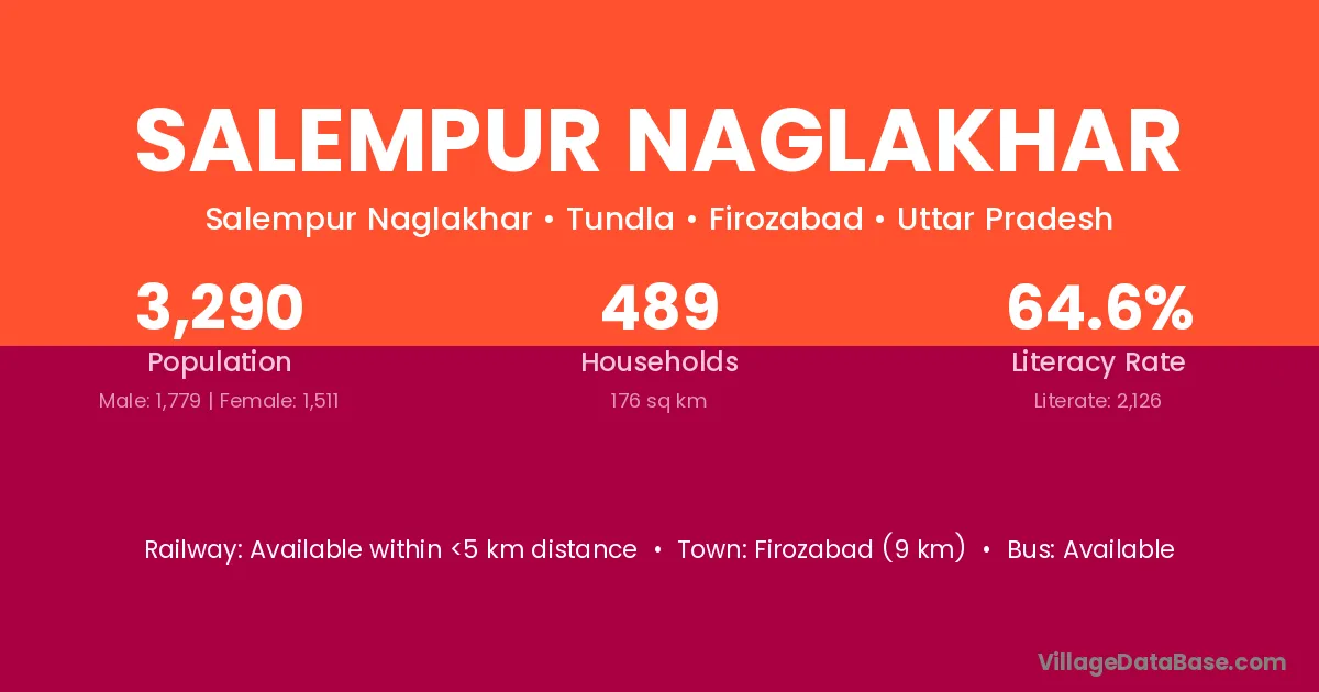 Firozabad (9 km) is the nearest town to Salempur Naglakhar village for major economic activities and is located approximately 9 km away.