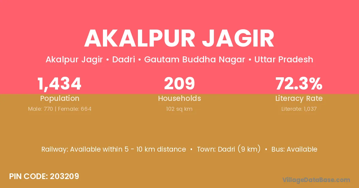 Akalpur Jagir village has a total population of 1,434 people, of which 770 are males and 664 are females.