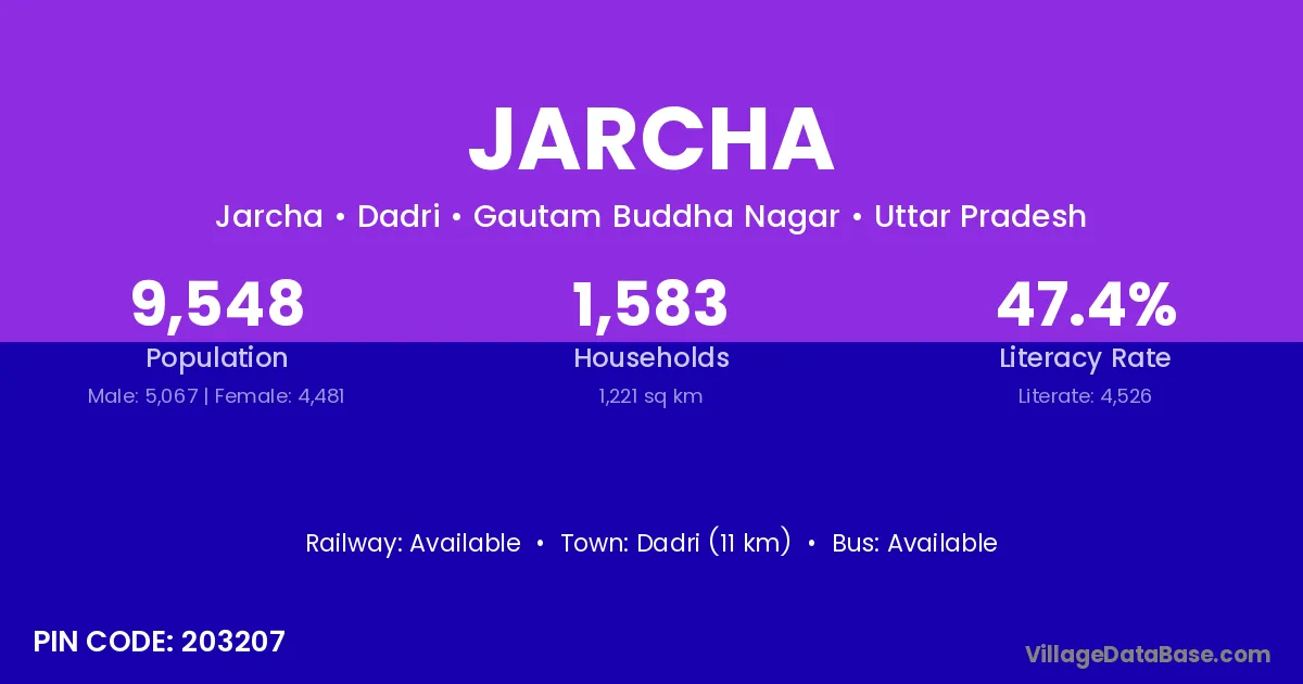 Jarcha village has a total population of 9,548 people, of which 5,067 are males and 4,481 are females.
