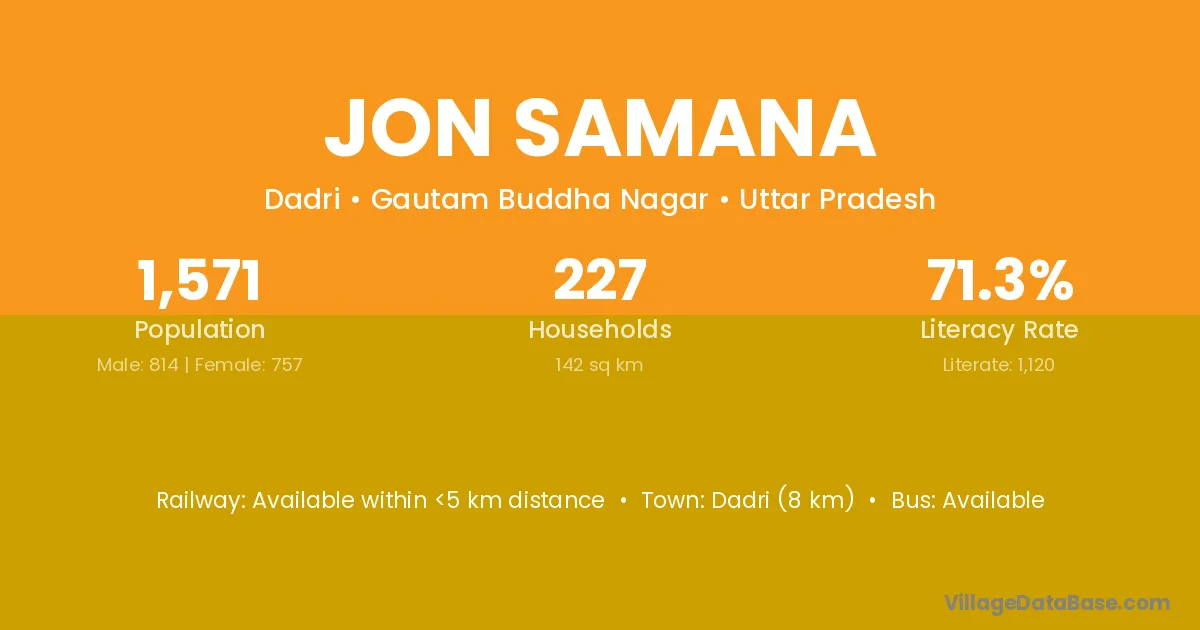 Jon Samana village has a total population of 1,571 people, of which 814 are males and 757 are females.