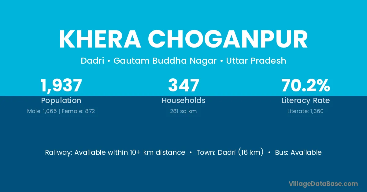 Dadri (16 km) is the nearest town to Khera Choganpur village for major economic activities and is located approximately 16 km away.