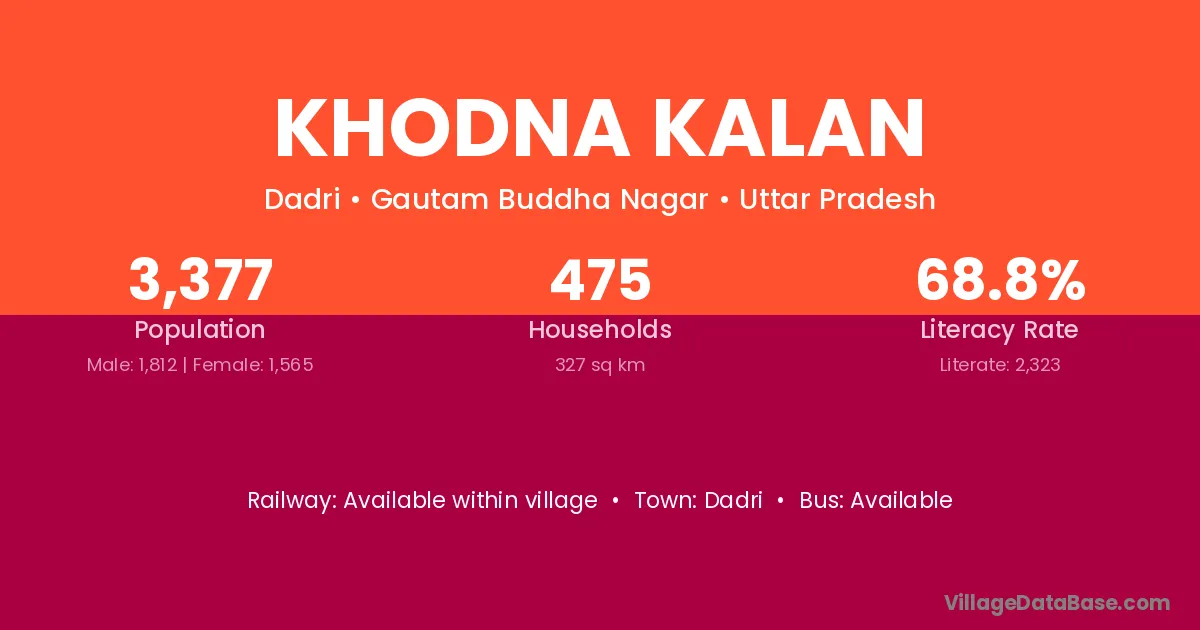 Khodna Kalan village has a total population of 3,377 people, of which 1,812 are males and 1,565 are females.