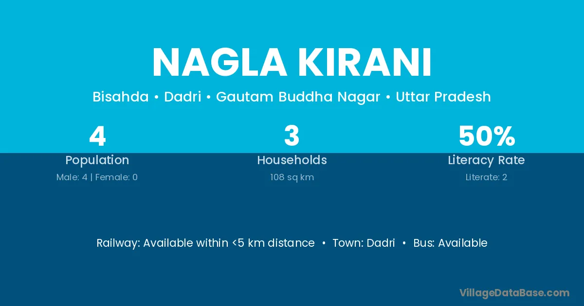 The literacy rate of Nagla Kirani village is 50.00%. Male literacy stands at 50.00% and female literacy at 0%.