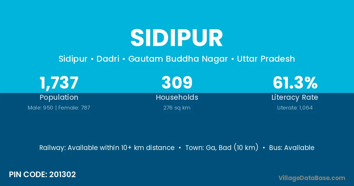 According to Census 2011 information, the village code of Sidipur village is 201302.