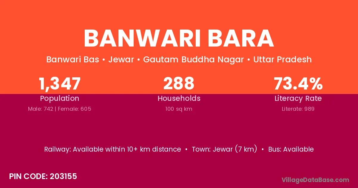 Jewar (7 km) is the nearest town to Banwari Bara village for major economic activities and is located approximately 7 km away.