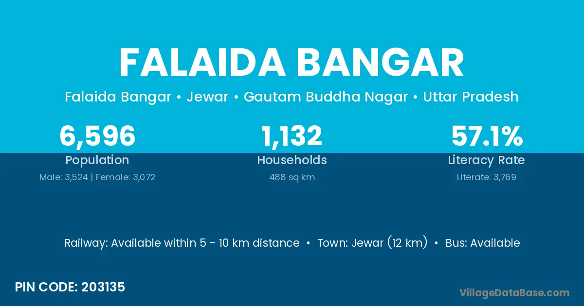 Jewar (12 km) is the nearest town to Falaida Bangar village for major economic activities and is located approximately 12 km away.