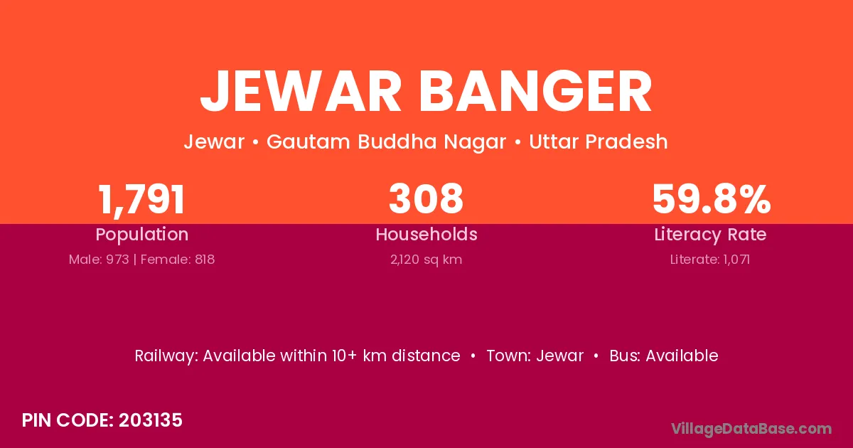 The literacy rate of Jewar Banger village is 59.80%. Male literacy stands at 69.06% and female literacy at 48.78%.