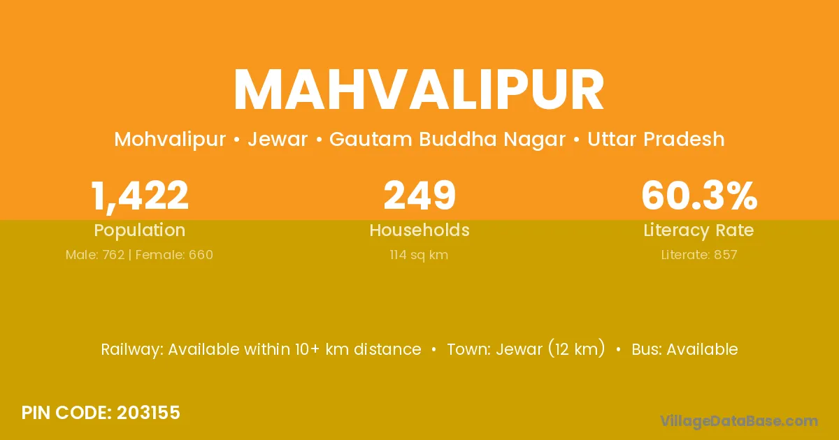 Jewar (12 km) is the nearest town to Mahvalipur village for major economic activities and is located approximately 12 km away.