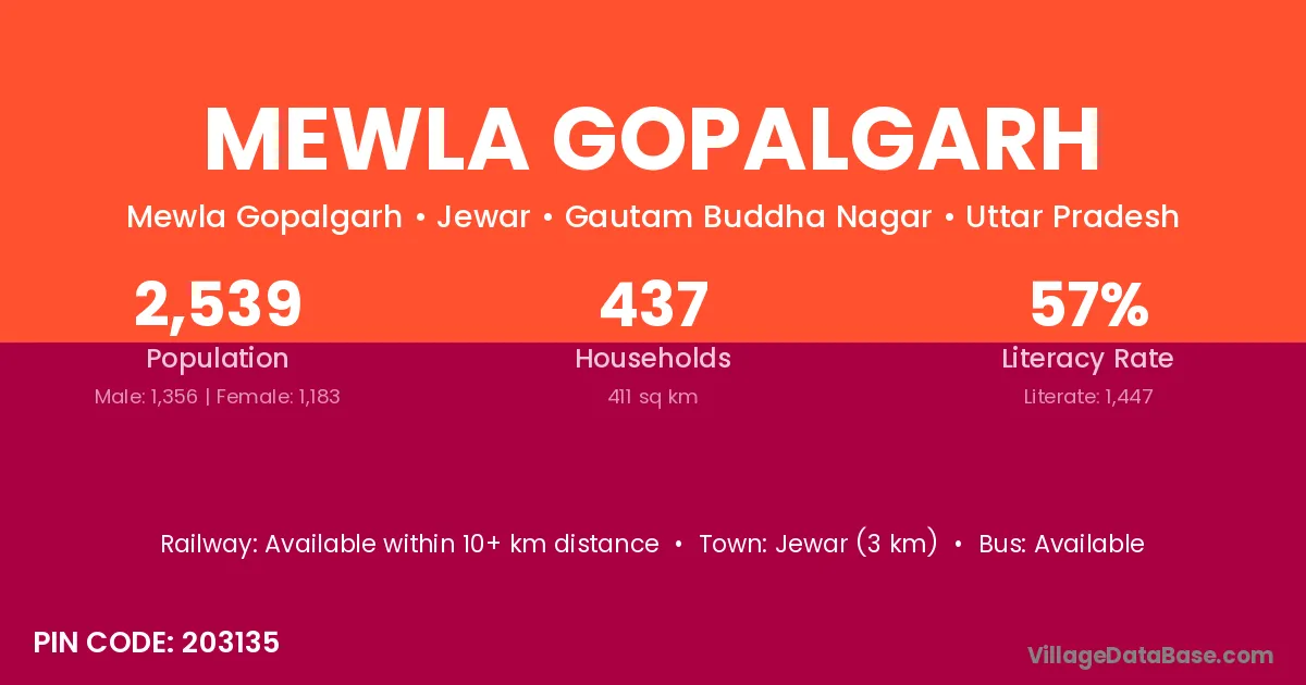 Jewar (3 km) is the nearest town to Mewla Gopalgarh village for major economic activities and is located approximately 3 km away.