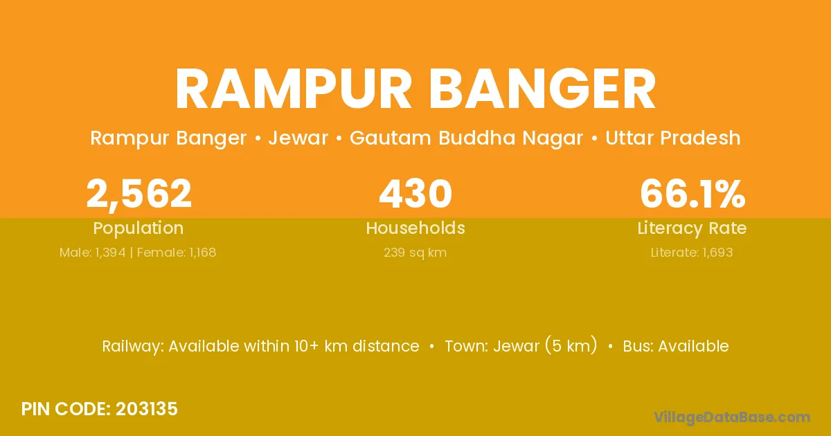 Jewar (5 km) is the nearest town to Rampur Banger village for major economic activities and is located approximately 5 km away.