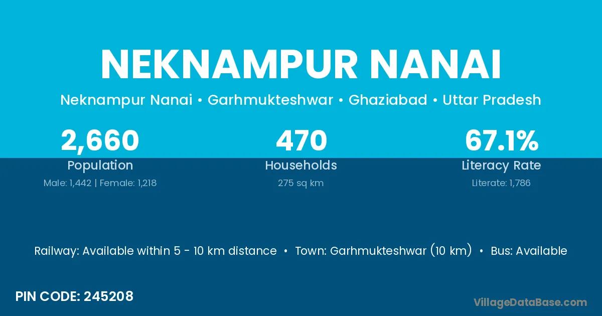 Garhmukteshwar (10 km) is the nearest town to Neknampur Nanai village for major economic activities and is located approximately 10 km away.
