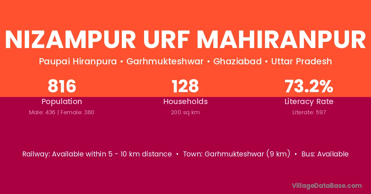 Nizampur Urf Mahiranpur village has a total population of 816 people, of which 436 are males and 380 are females.