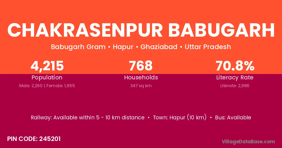 Hapur (10 km) is the nearest town to Chakrasenpur Babugarh village for major economic activities and is located approximately 10 km away.
