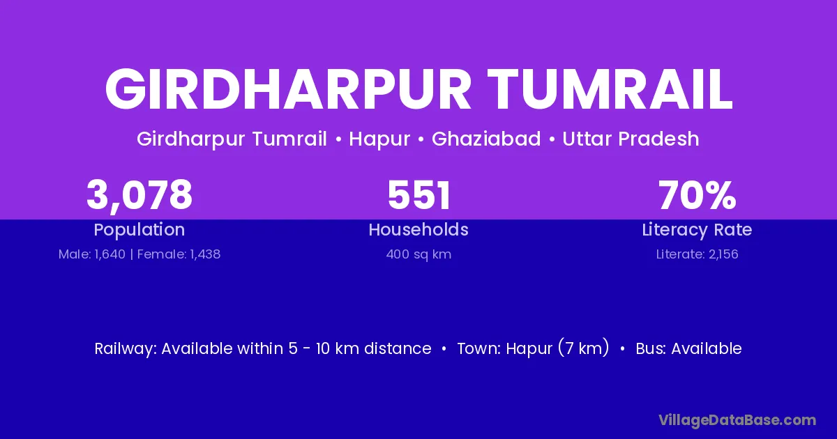 Hapur (7 km) is the nearest town to Girdharpur Tumrail village for major economic activities and is located approximately 7 km away.