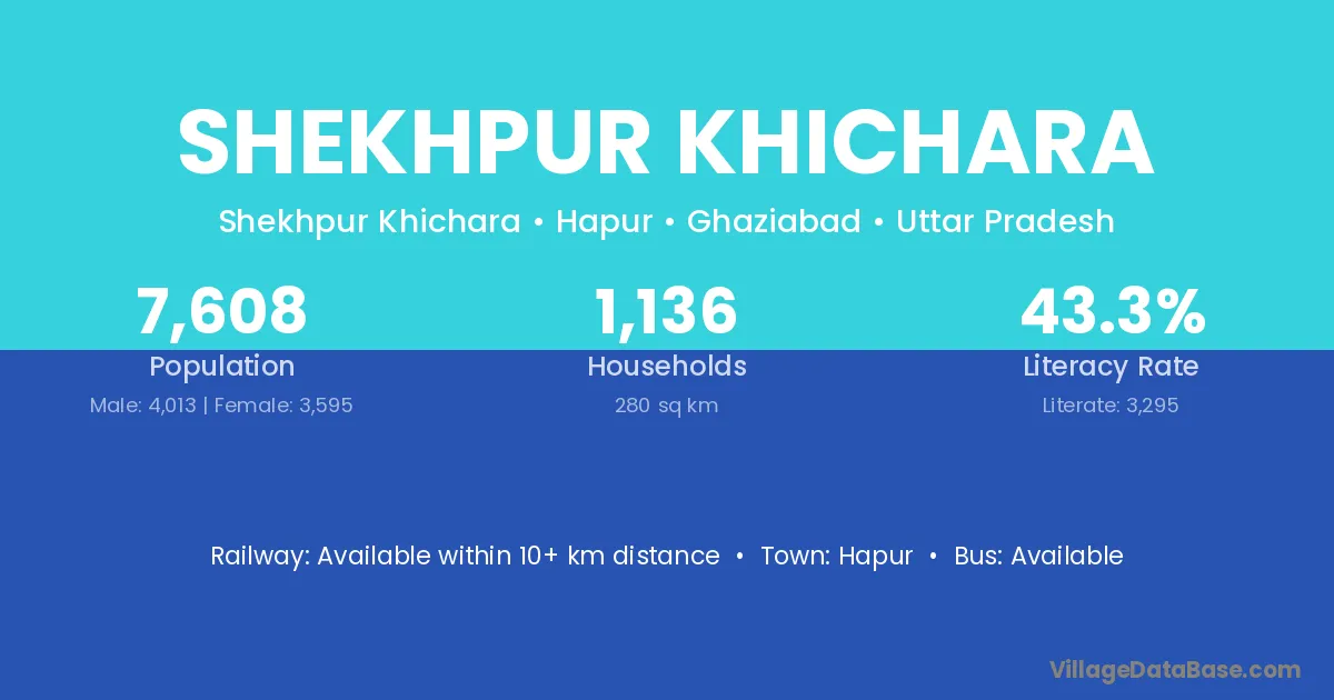 Shekhpur Khichara village has a total population of 7,608 people, of which 4,013 are males and 3,595 are females.