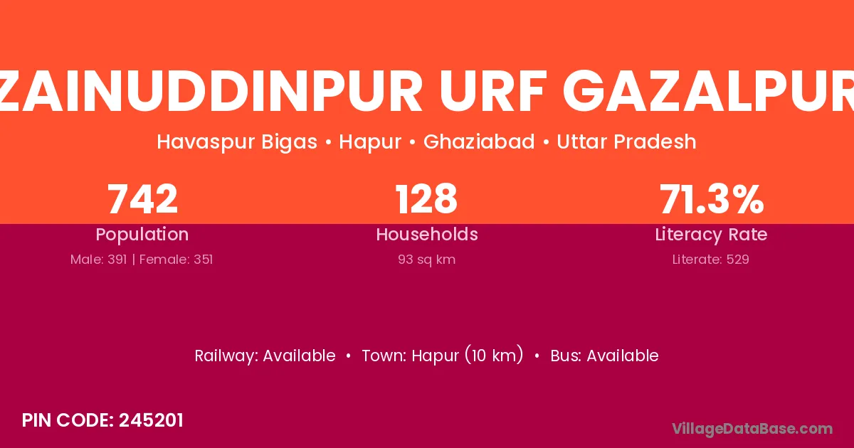 Zainuddinpur Urf Gazalpur village has a total population of 742 people, of which 391 are males and 351 are females.