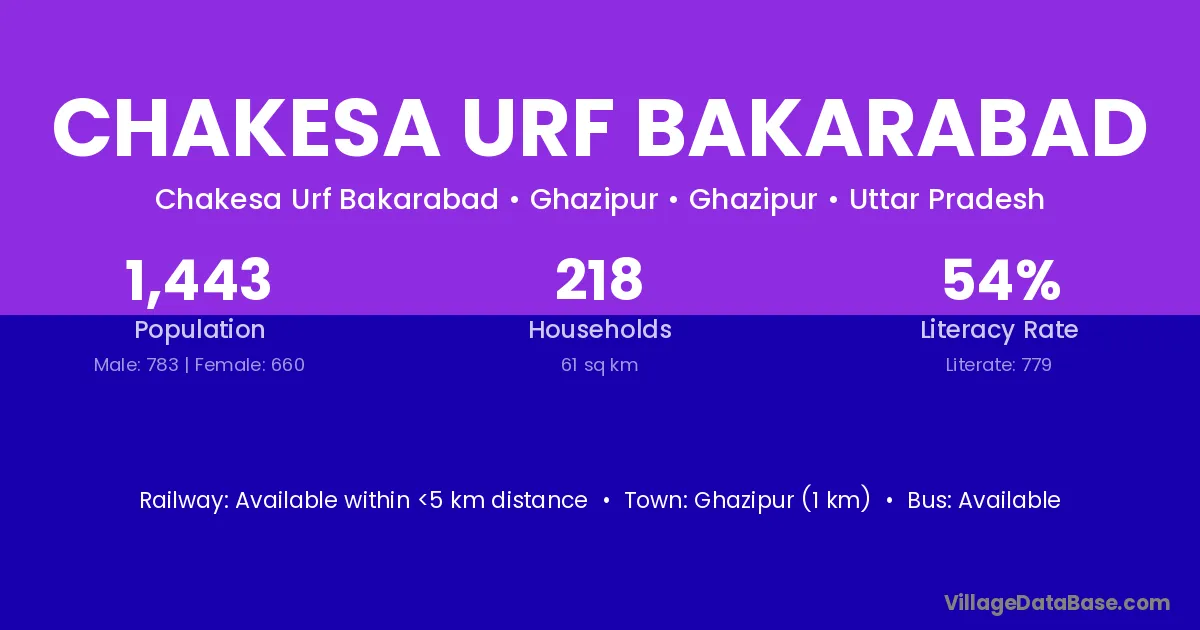 Chakesa Urf Bakarabad village has a total population of 1,443 people, of which 783 are males and 660 are females.