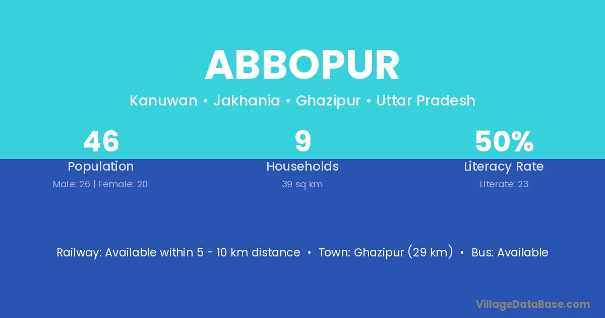 Ghazipur (29 km) is the nearest town to Abbopur village for major economic activities and is located approximately 29 km away.