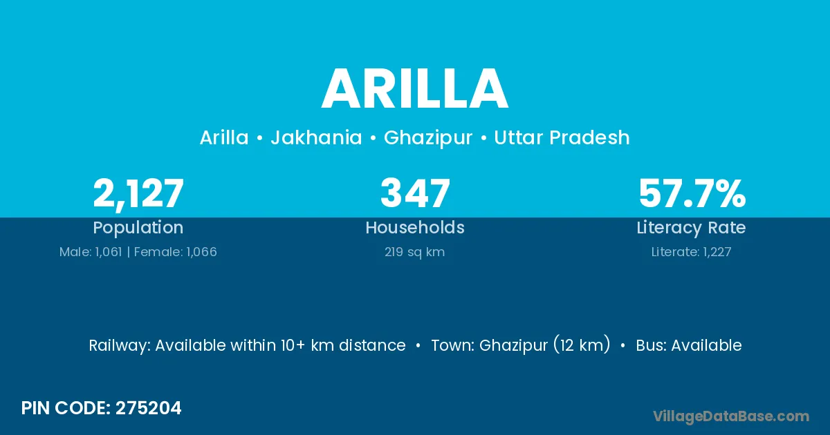 Ghazipur (12 km) is the nearest town to Arilla village for major economic activities and is located approximately 12 km away.
