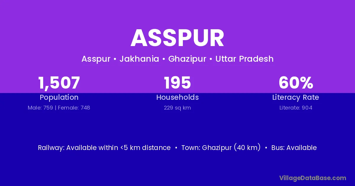 Ghazipur (40 km) is the nearest town to Asspur village for major economic activities and is located approximately 40 km away.